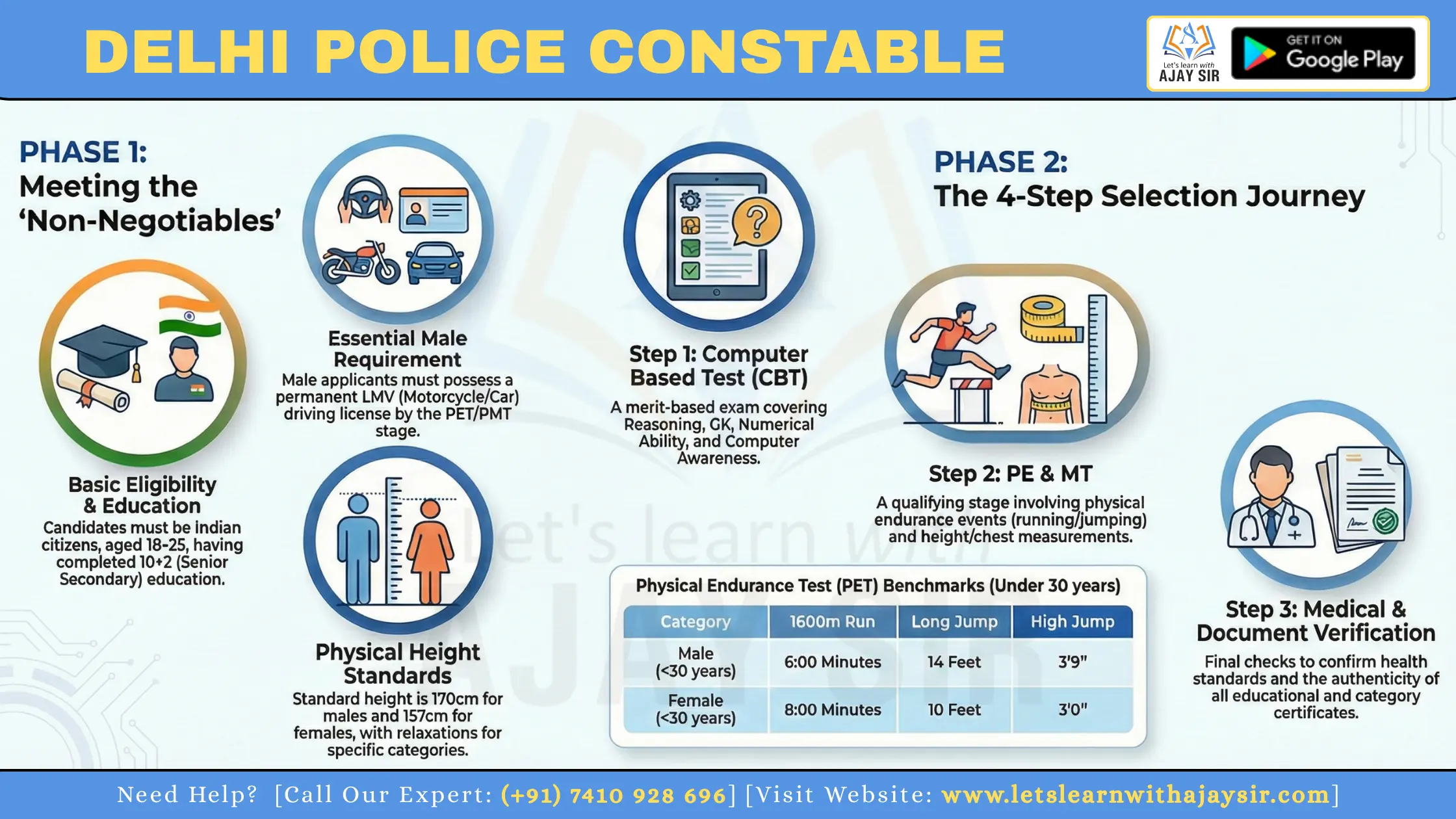Male candidates need a valid, permanent LMV licence (motorcycle/car) by the PET/PMT stage. Learner permits are not accepted, so secure a full licence early.