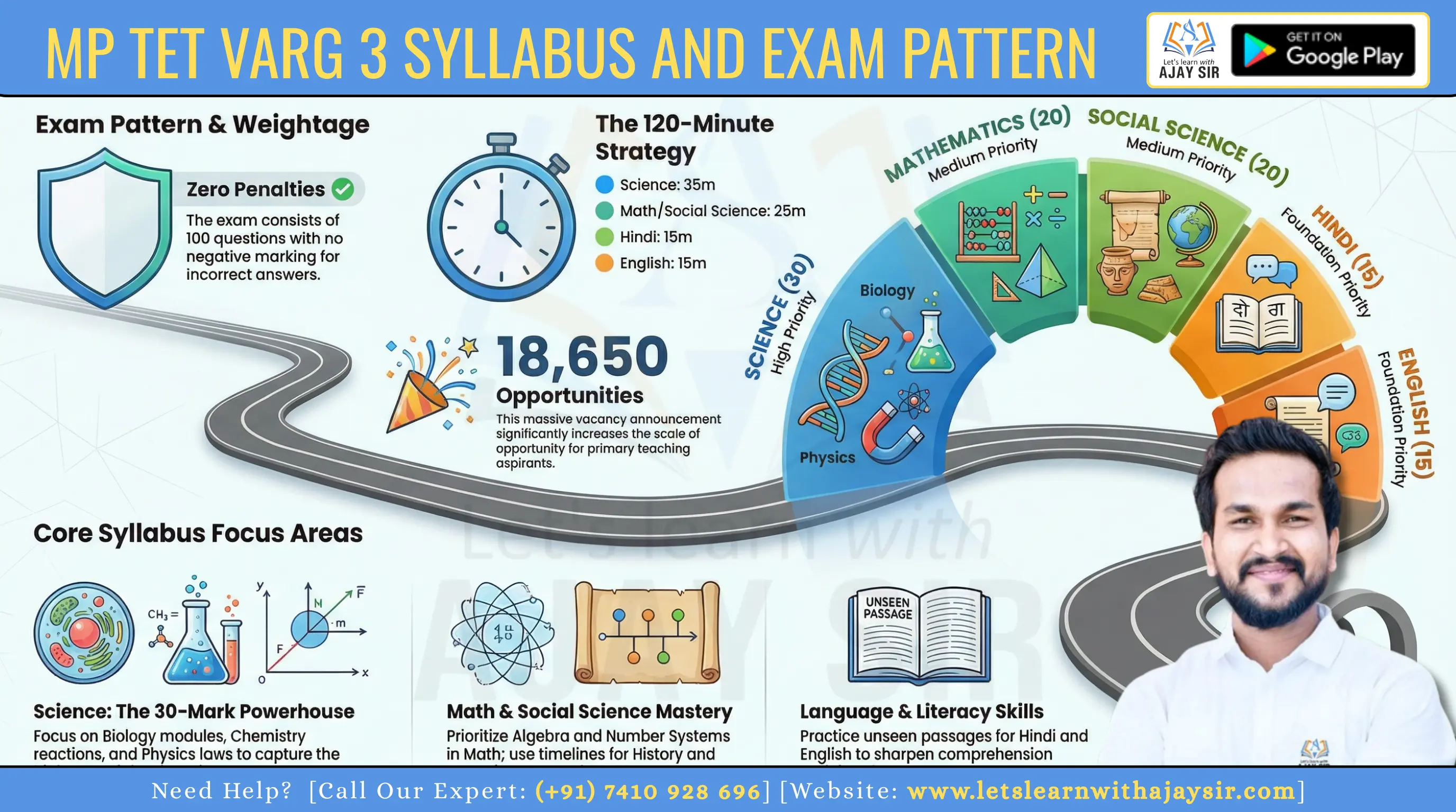 The recruitment covers five core subjects — Hindi, English, Mathematics, Science and Social Science — with 100 questions for 100 marks. There is no negative marking and the total duration is two hours, so you can attempt boldly while managing time smartly.